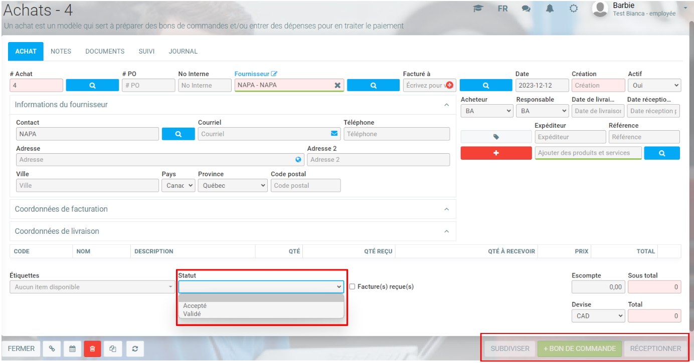 Tant que cette personne n'a pas validé l'achat, les boutons situés en bas de la page (Réceptionner, par exemple) sont grisés.