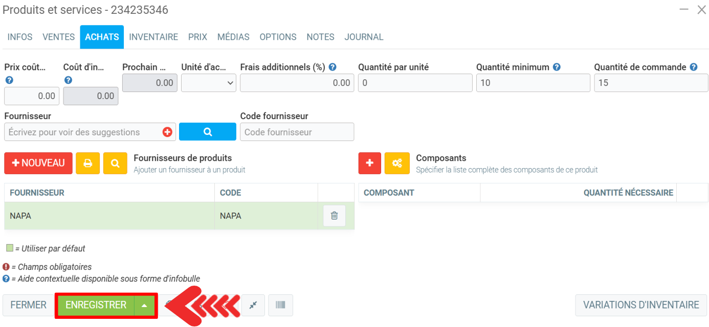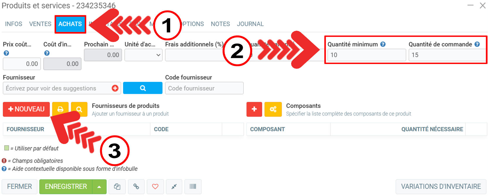Dans l'onglet Achats, entrez la Quantité minimum et la Quantité de commande.