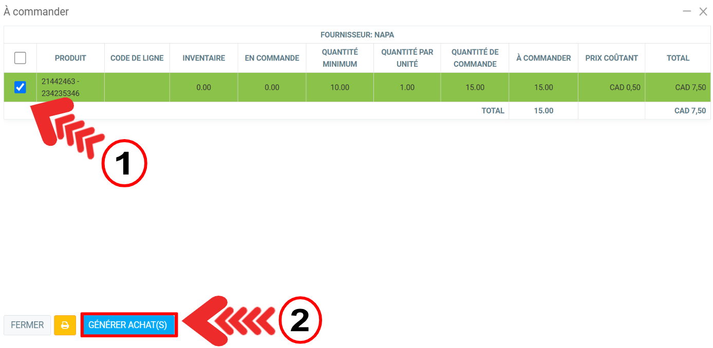 Dans la fenêtre suivante, cochez le produit e cliquez sur Générer achat(s).
