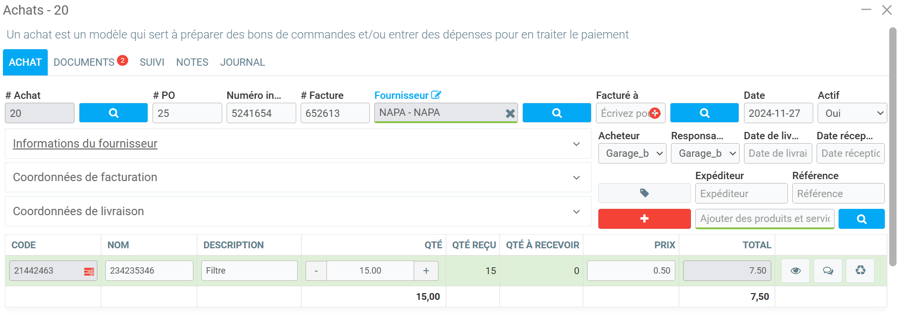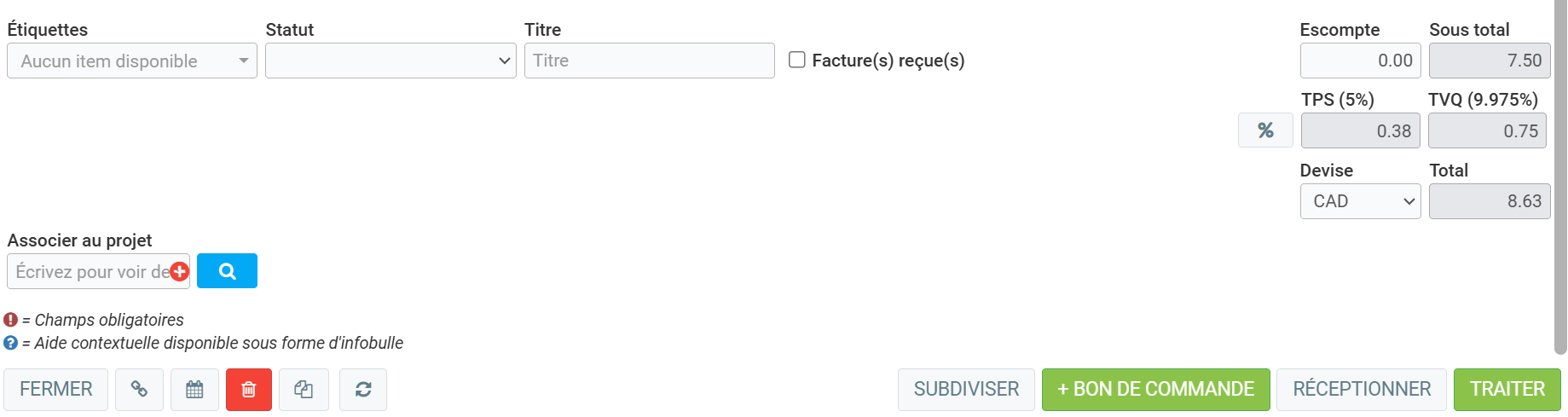 Lorsque vous ouvrez l'achat, vous avez accès aux détails et pouvez Subdiviser, générer un Bon de commande, Réceptionner ou Traiter l'achat.