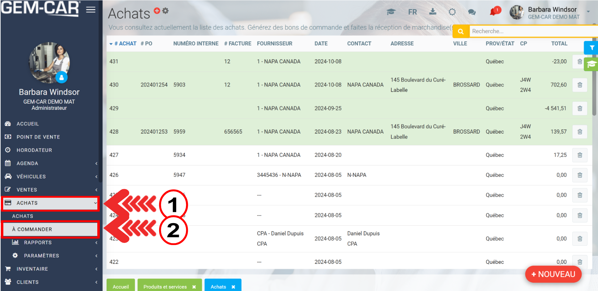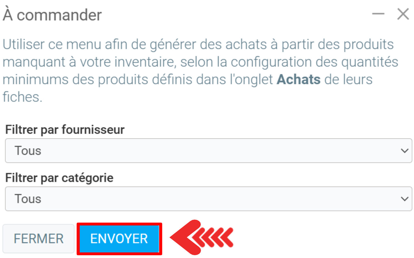 Lorsque vous sélectionnez l'onglet Achats > À Commander, une nouvelle fenêtre s'ouvre pour vous permettre de confirmer le fournisseur et la catégorie.