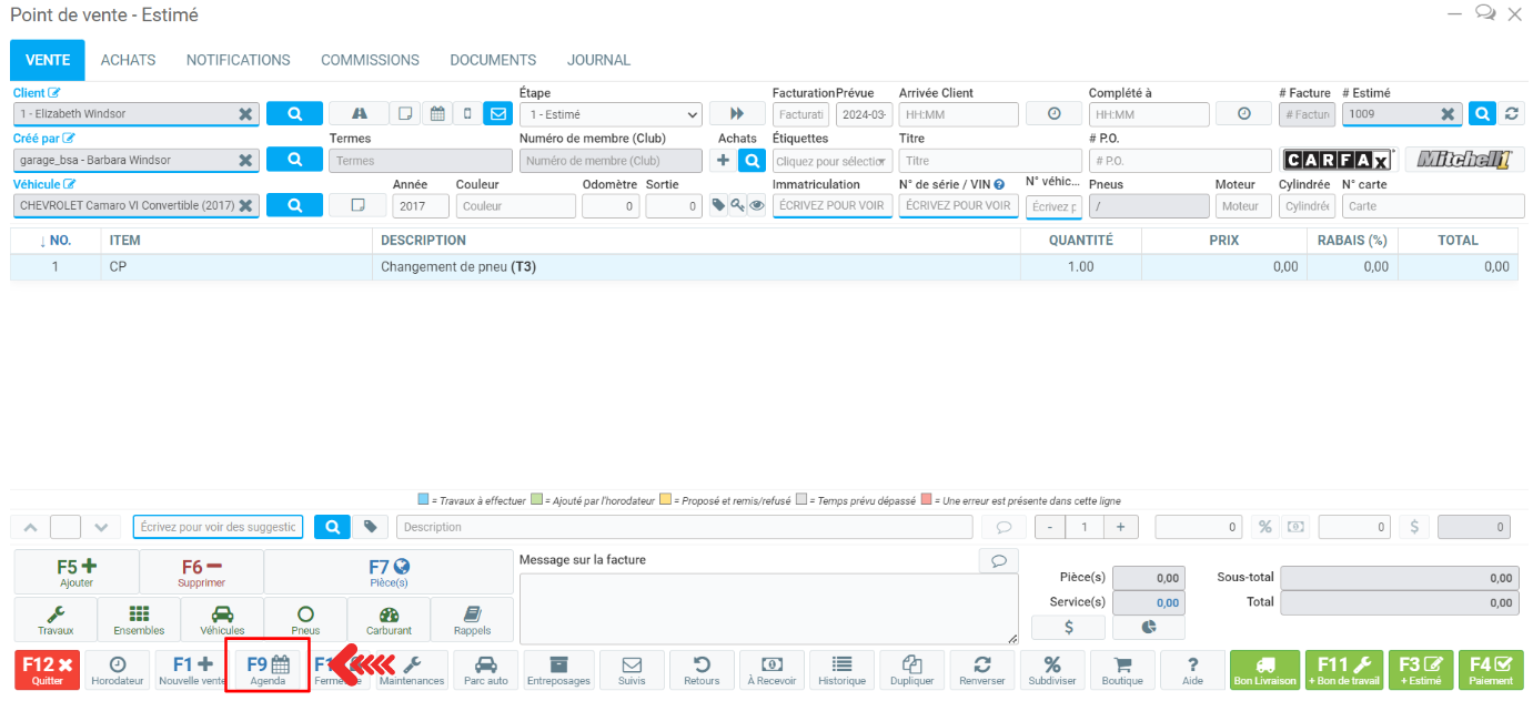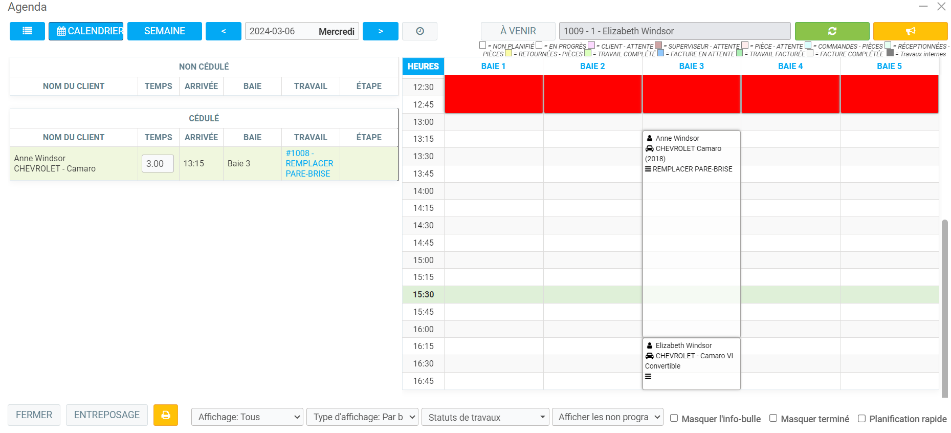 Sélectionnez l'horaire du mécanicien, et sélectionnez une heure qui correspond à son horaire. Cliquez à gauche et le message ''Déplacer tous les rendez-vouz de cette vente vers cette case'' apparaîtra s'il y a plus d'un travail affiché et cliquez sur Oui: