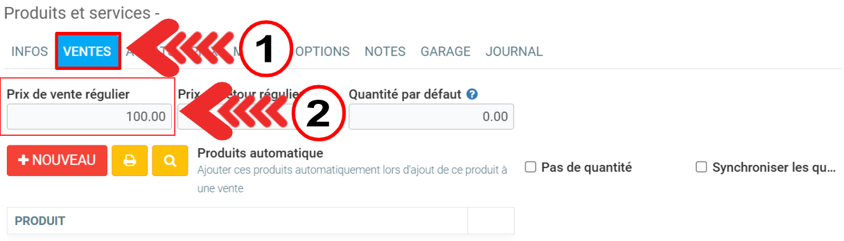 Pour définir un prix pour le travail, appuyez sur dans le menu de Inventaire> Produits et Services > onglet Ventes.