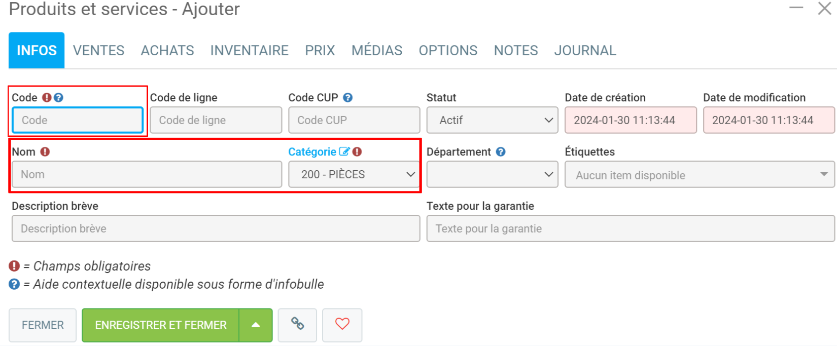 Pour le champ catégorie, seule l'option par défaut, à savoir 200 pièces, sera sélectionnée, mais pour créer un travail, sélectionnez 500-JOB (heures).