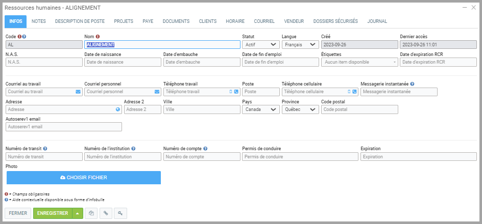 - Sous l'onglet Info, sélectionnez le Technicien lié à cette baie. Il s'agit ici de sélectionner une ressource telle que créée à l'étape 2 ci-haut. Il pourrait s'agir du poste de travail d’Alignement par exemple.
