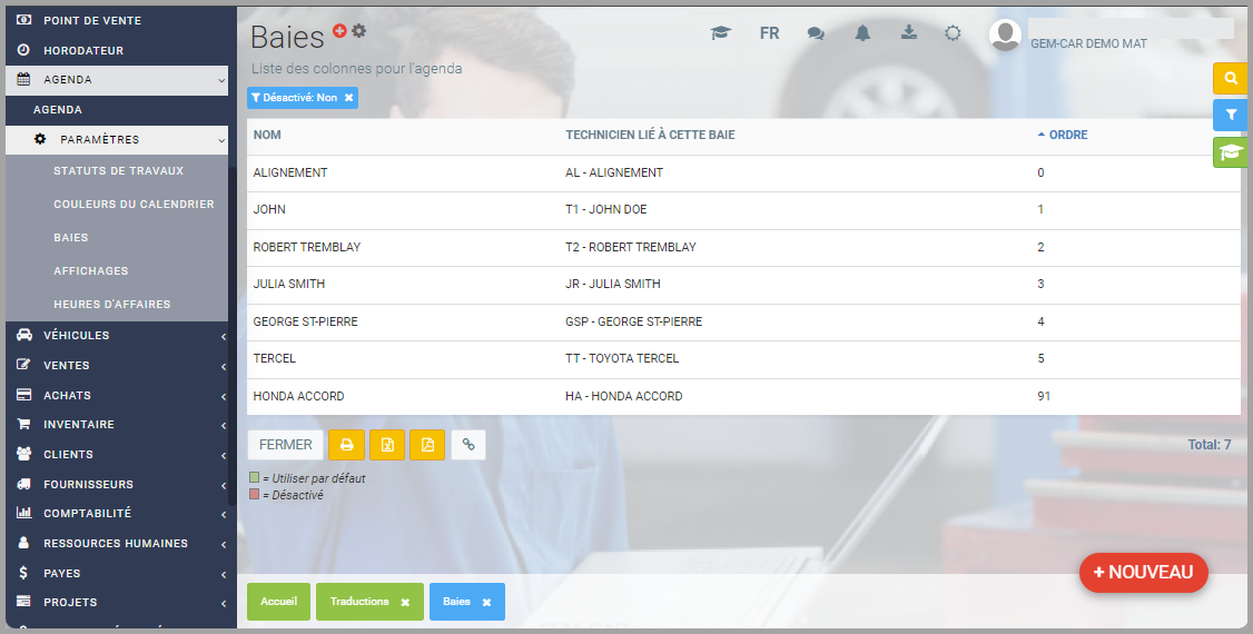 Dans le contexte de GEM-CAR, une baie représente un espace de travail. Il peut s'agir d'un lift, d'un technicien, ou d'un espace de travail. Si j'ai 3 baies disponibles, cela signifie que j'ai 3 espaces avec au moins un technicien pour exécuter le travail.