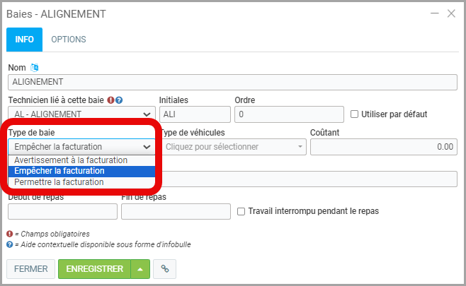 - Ensuite, en ce qui concerne le Type de baie, Empêcher la facturation permet de s'assurer qu'un technicien a été assigné à la tâche et s'assurer du temps qu'il passe sur la tâche avant de facturer en lui permettant d'utiliser l'horodateur. C'est l'option que nous allons le plus souvent choisir.