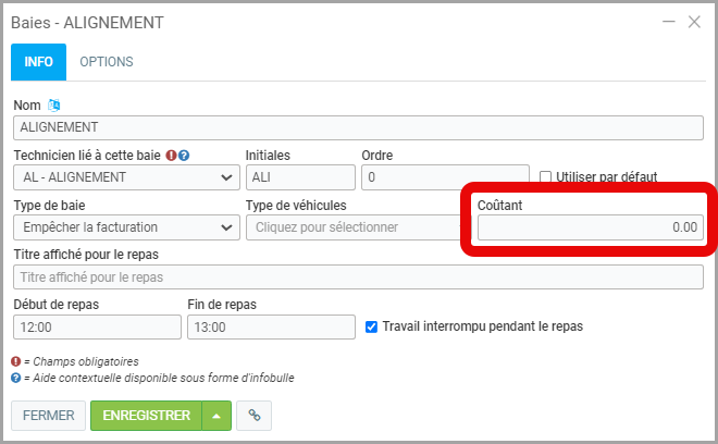 Notez que si rien n'est mis dans Titre affiché pour le repas, Diner apparaîtra par défaut. - Sous l'onglet Options, si la Baie concerne une ressource humaine en particulier, il peut être important de sélectionner Le technicien assigné à cette baie peut s'assigner des travaux non assignés pour lui permettre de poinçonner sur le travail d'un autre mécanicien.