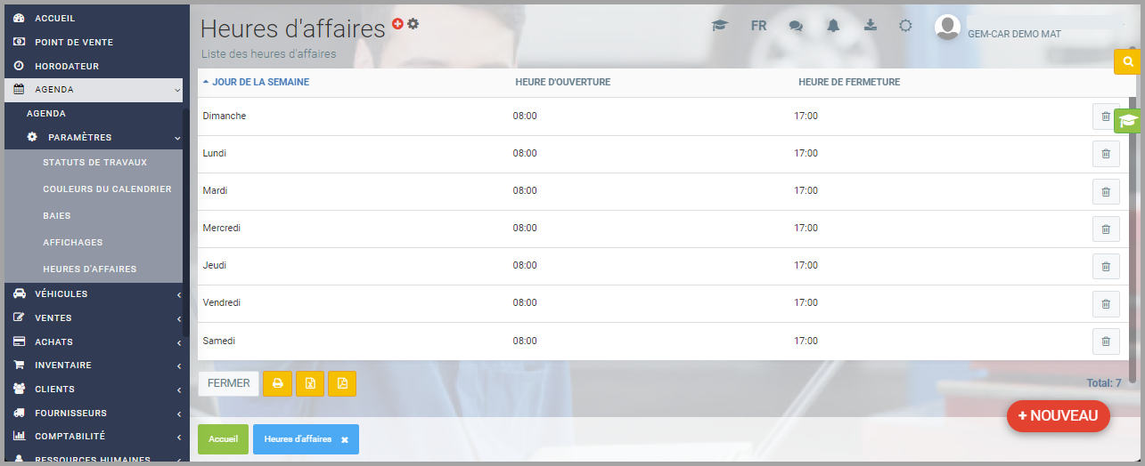 - Précisez les Heures d'affaires. Dans le Menu principal situé à gauche de l'application, cliquez sur Agenda > Paramètres > Heures d'affaires.