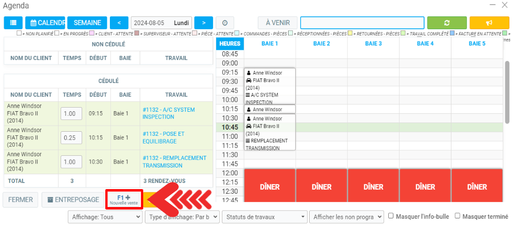 Cliquez sur un espace vide de votre Agenda dans la baie souhaitée ou cliquez sur le bouton F1+ Nouvelle vente à côté du bouton de entreposage, dans le coin gauche de la page.