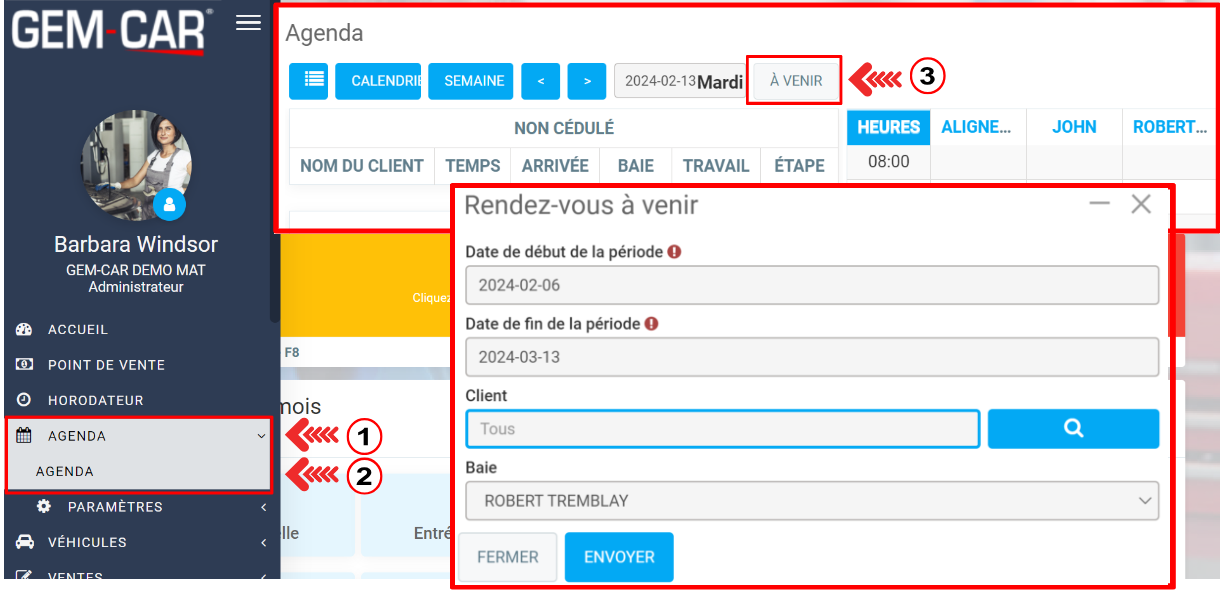 Pour trouver un rendez-vous prévu pour un client, cliquez sur le menu principal de gauche > Agenda > Agenda > À venir.