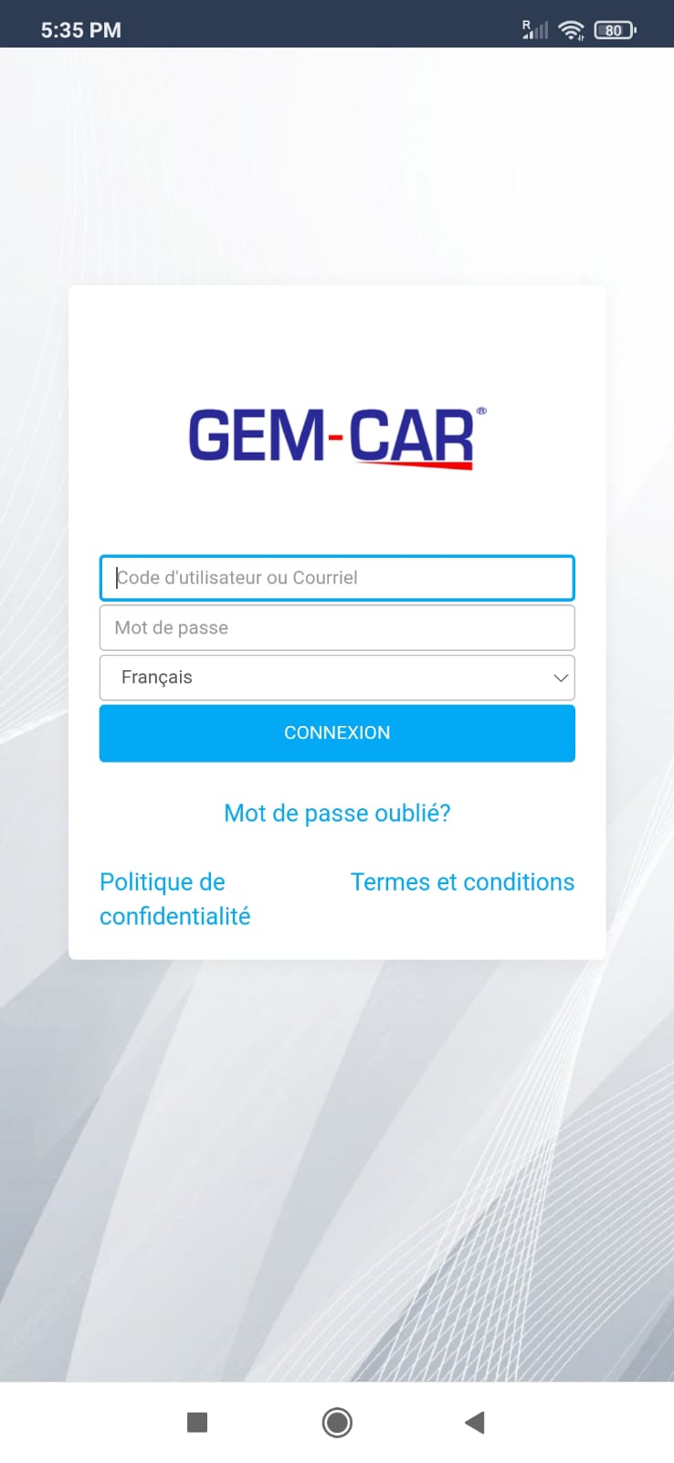 Vous pouvez accéder à votre compte GEM-CAR avec votre code d'utilisateur ou courriel et votre mot de passe.