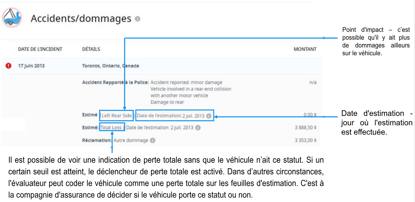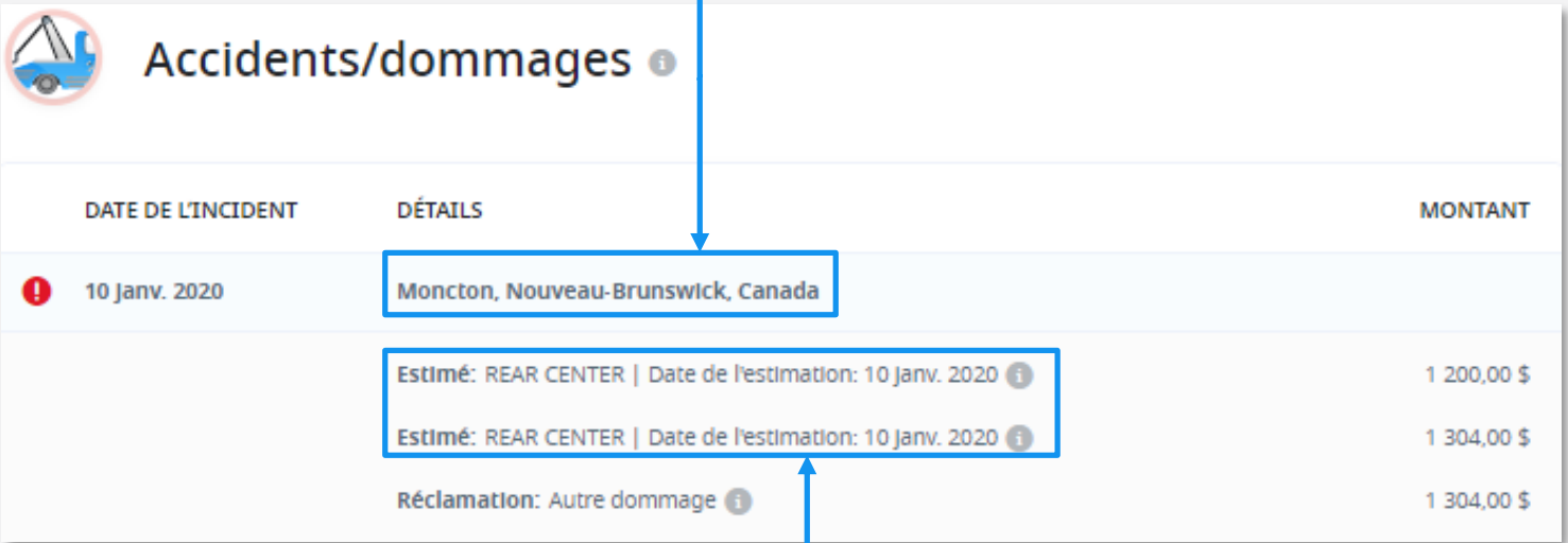 Certains propriétaires visiteront plusieurs établissements d'estimation pour évaluer leurs dommages avant d'envoyer les montants définitifs à leur compagnie d'assurance, ou l'évaluateur peut avoir trouvé des dommages supplémentaires et rempli une estimation supplémentaire. Dans cet exemple, il semble que deux estimations ont été effectuées pour le même incident. Faites attention à la date de l'incident, car elle vous montrera clairement combien d'incidents antérieurs ont été rapportés pour ce véhicule selon nos sources.