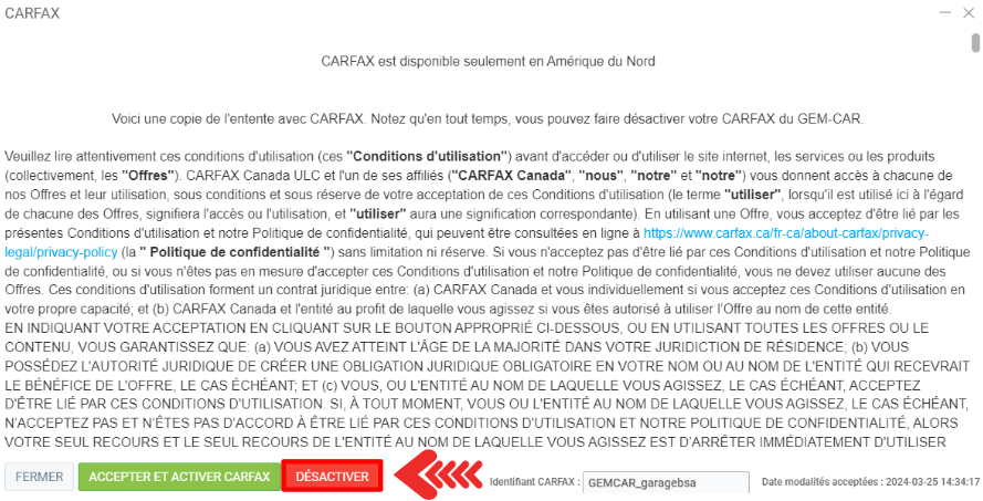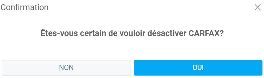 Une fenêtre de confirmation s'ouvre avec le message: ''Êtes-vous certain de vouloir désactiver CARFAX?''