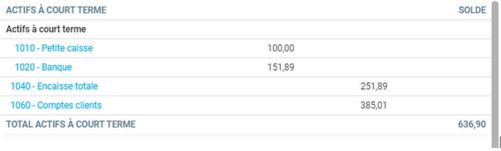 Les comptes 1010 et 1020 sont des « Compte de sous-groupe », ils sont écrits avec un retrait. Le compte 1040 est plutôt un compte « Total de sous-groupe », il indique la somme des comptes de sous-groupes au-dessus de lui. Ce type de compte n’est pas utilisable dans une transaction.