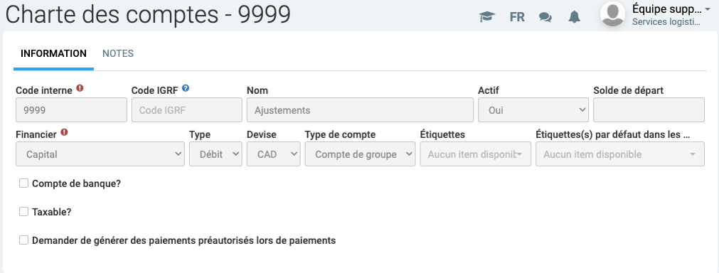 Un compte d'ajustement sert principalement comme compte temporaire lors d'une importation. Nous suggérons d'utiliser le compte de "Ajustements" que nous codons avec les lettres AJ lors de l'importation d'une charte, détaillé dans les sections suivantes.