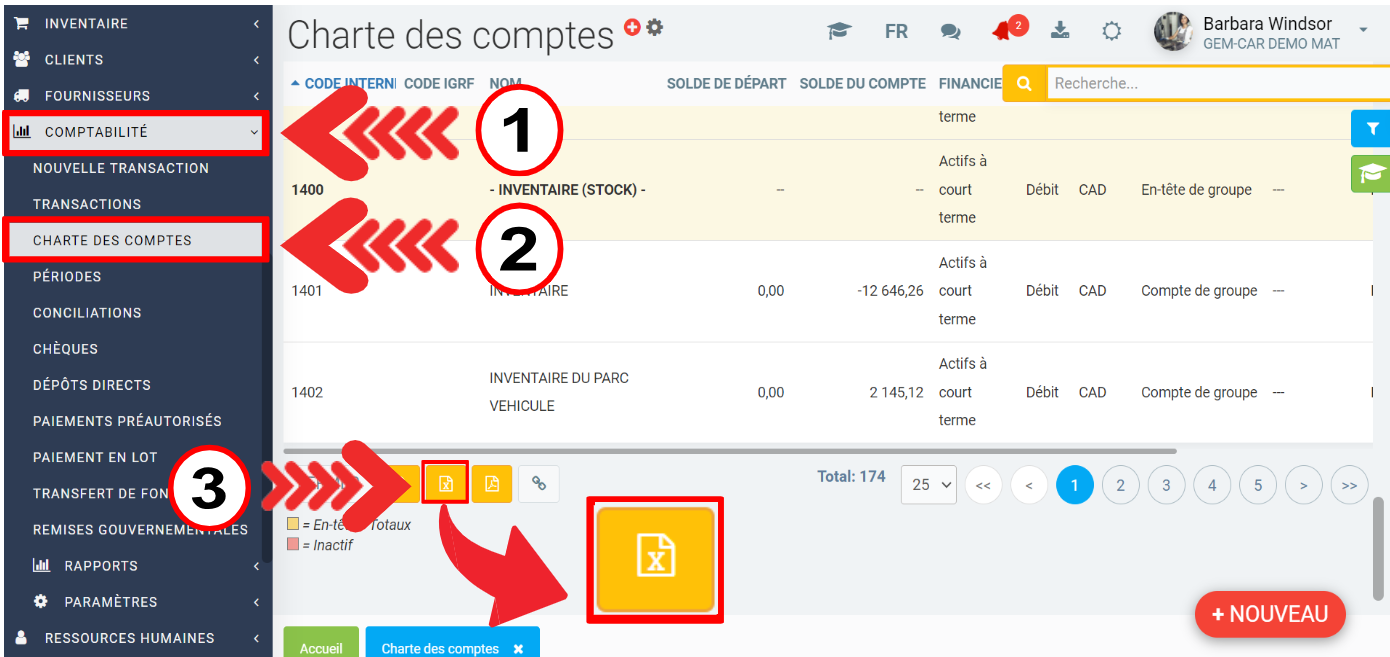 Pour exporter la Chart des comptes, cliquez sur Comptabilité > Charte des comptes. Pour procéder à l'exportation des données de la liste que vous êtes en train de consulter vers un fichier en format Excel, simplement cliquer sur l'icône jaune “X”.