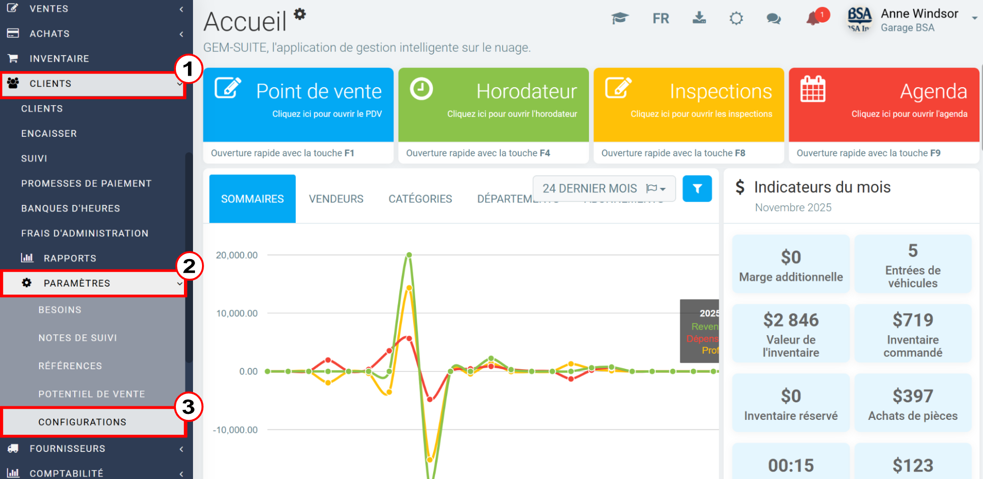 Pour configurer cette fonction, cliquez sur le menu de gauche, sur l'onglet Clients > Paramètres > Configurations.