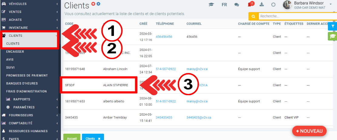 Pour consulter l'historique, rendez-vous sur Clients > Clients.