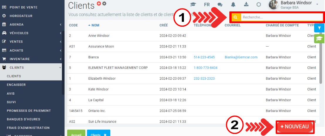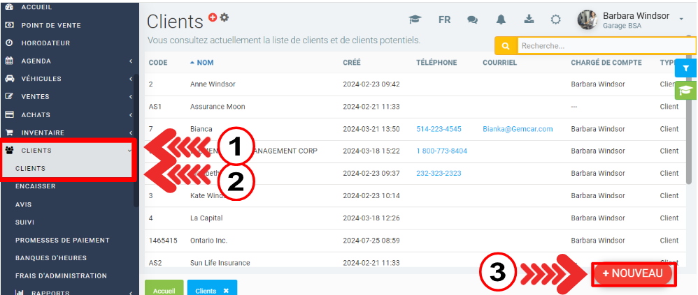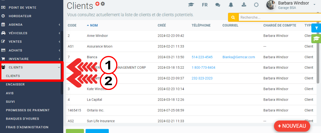 Advenant que le résultat de votre recherche soit infructueux, cliquez sur +Nouveau en bas à gauche pour créer un nouveau client.