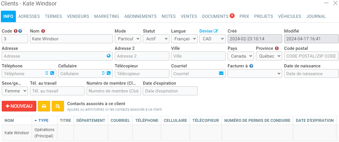 Vous pouvez alterner entre le mode Entreprise et Particulier. La différence majeure entre les deux est que l'entreprise peut, par exemple, avoir des contacts, tandis que le particulier à des champs propres comme le numéro d'assurance social, numéro d'assurance maladie et une date de naissance.