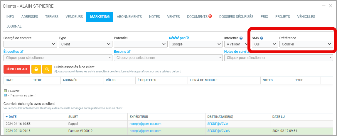 Un autre élément important dans la création d'un nouveau client concerne les mode de communication à utiliser avec votre client. Sous l'onglet Marketing, il est important d'indiquer si le client accepte de recevoir des SMS s'il s'agit d'un moyen de communication utilisé par l'entreprise. Le consentement du client est nécessaire en regard de la loi et il faudra l'obtenir et sélectionner Oui ou Non pour chacun de vos clients.