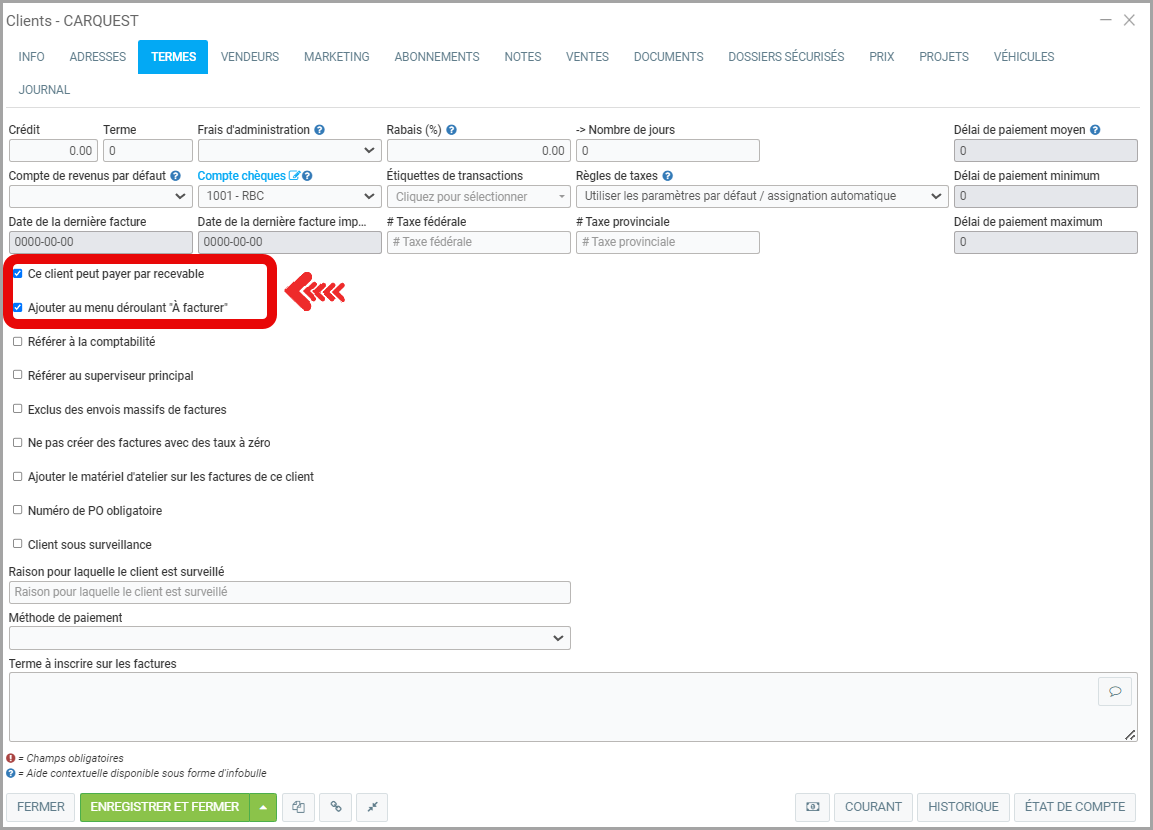 - D'ailleurs, sous l'onglet Termes, ne pas oublier de cocher Ce client peut payer par recevable le cas échéant. Si l'option n'est pas coché, l'option ne sera pas offert dans les modes de paiement.