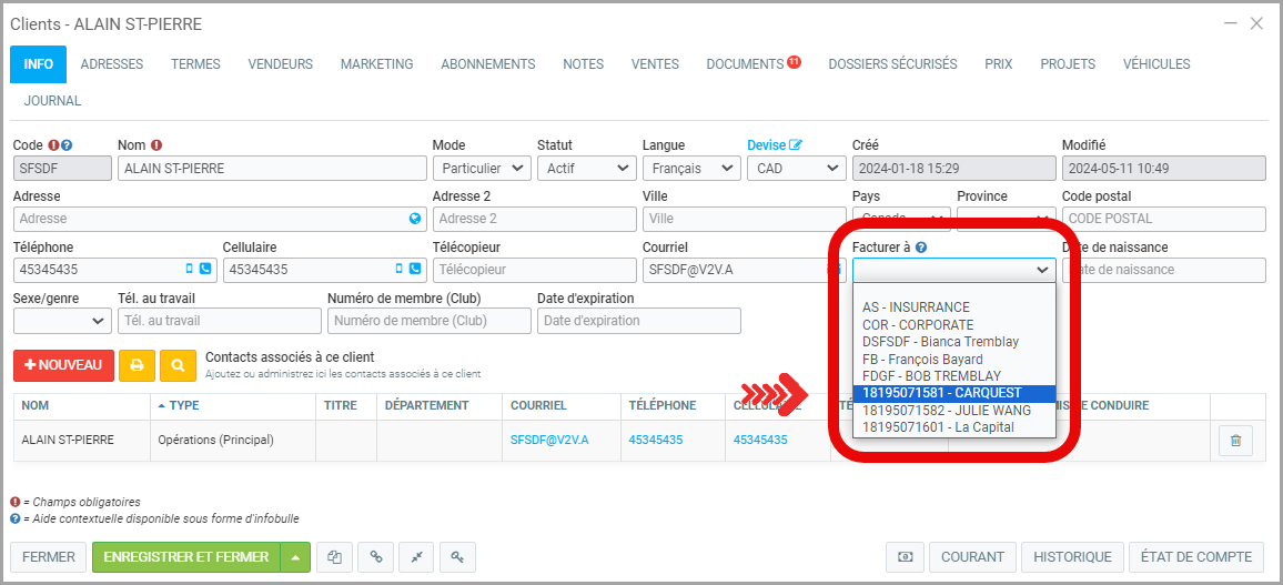 Par exemple, le client CARQUEST doit être créé. L'option est sélectionné. Ainsi, pour un autre client, Facturé à CARQUEST peut être sélectionné. Alain St-Pierre pourrait venir comme client à notre atelier et les services qui lui serait offert serait facturé à CARQUEST.