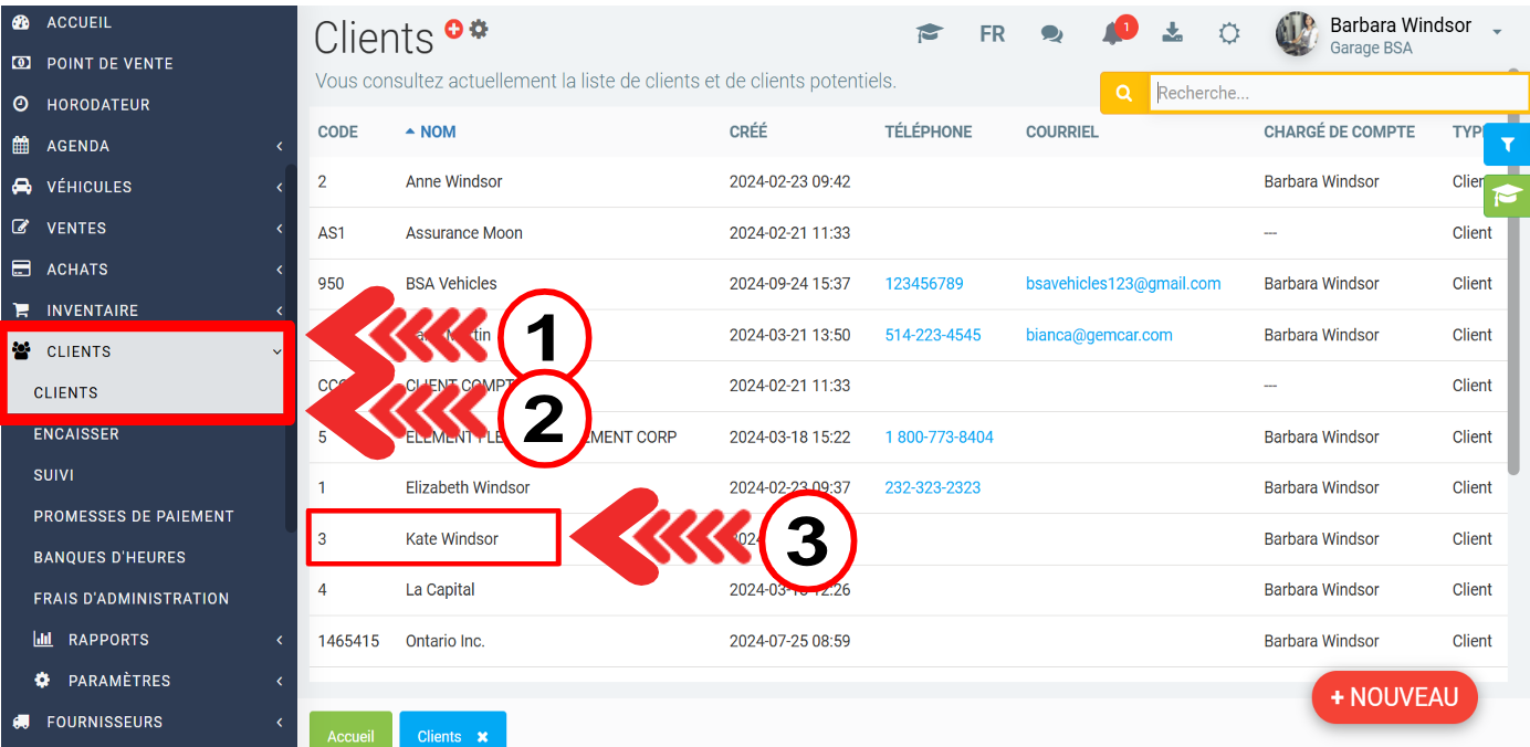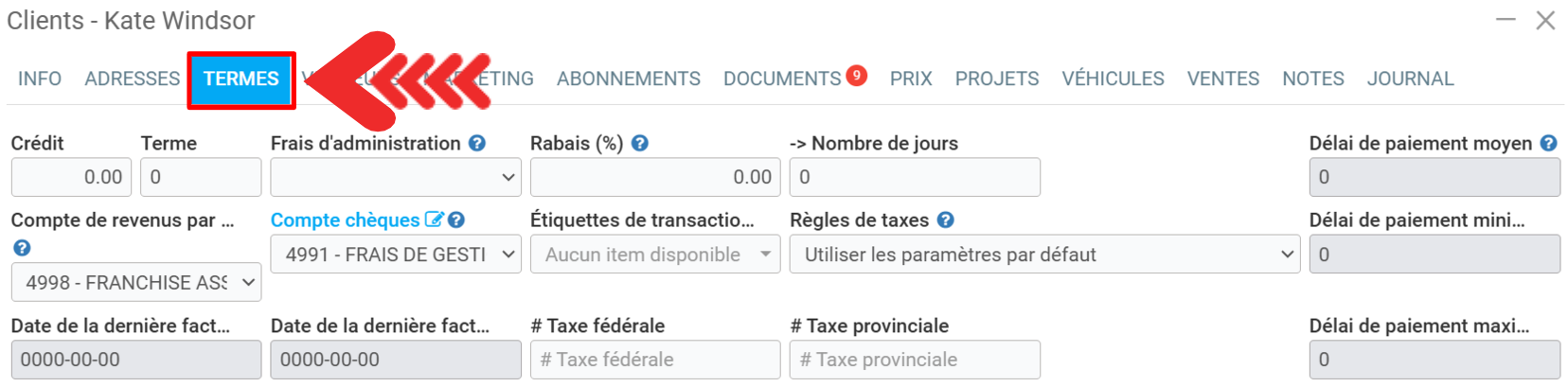 Pour vérifier les termes relatives au client, cliquez sur Clients > Clients. Sélectionnez le client souhaité.