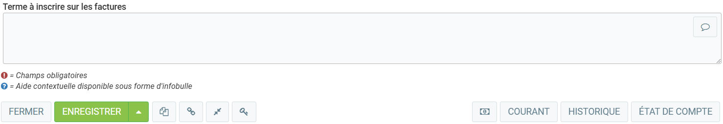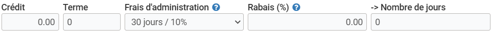 La première ligne de champs mentionne si le client possède un CRÉDIT qu’il a pour utiliser vos services ou consommer vos produits. Le "Code Crédit" est propre à vos activités. Vous pouvez également remplir le champ "Terme" pour définir pendant combien de temps le client peut utiliser ce crédit. Si vous avez accordé une réduction spéciale à ce client, insérez dans le champ "Rabais (%)", avec la condition de paiement avant une date que vous allez déterminer.