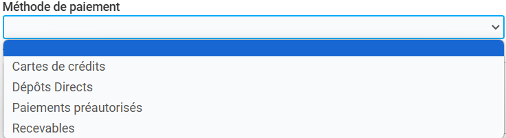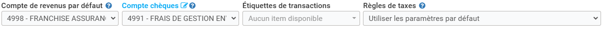 La ligne de champs suivante n’est pas à remplir. Il s’agit des comptes à créditer pour le paiement. Vous n’avez pas à vous préoccuper, le système utilisera les comptes par défaut. Il en est de même pour les taxes, la solution prendra en compte les règles par défaut du système par province et par pays.