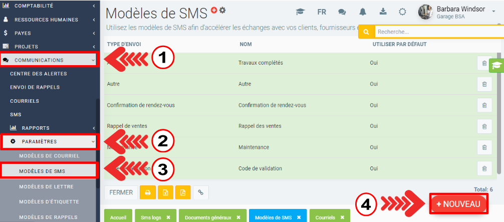Dans le menu de gauche, cliquez sur Communications > Paramètres > Modèles de SMS > +Nouveau.