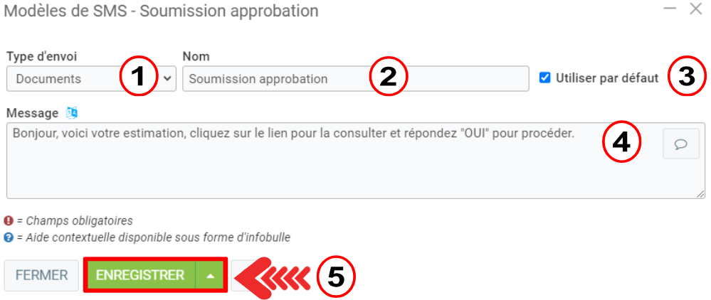 Dans la fenêtre suivante, sélectionnez le Modèle de SMS "Soumission approbation".
