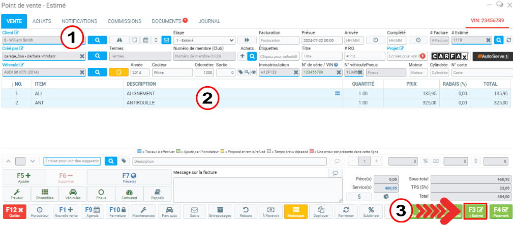 Sélectionnez le client, les services et appuyez sur F3 ou cliquez sur Estimé.