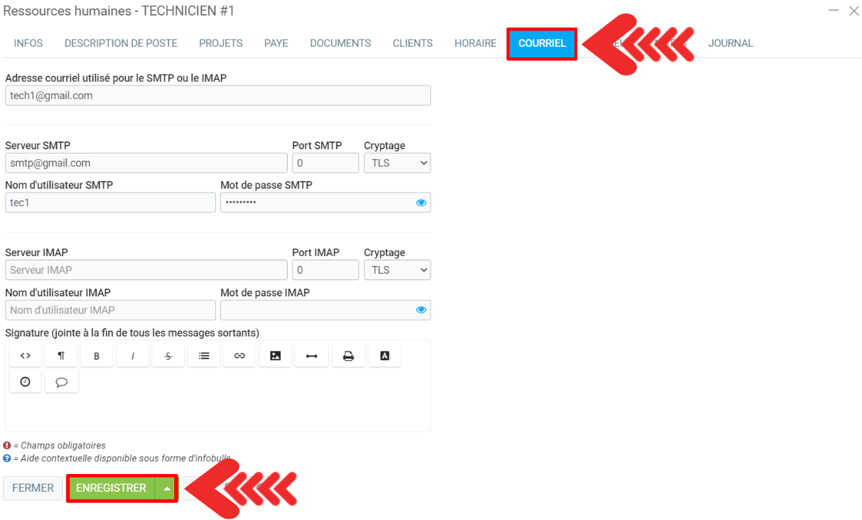 Pour ce faire, cliquez sur Ressources humaines > Ressources humaines, sélectionnez un fichier, cliquez sur l'onglet Courriel.