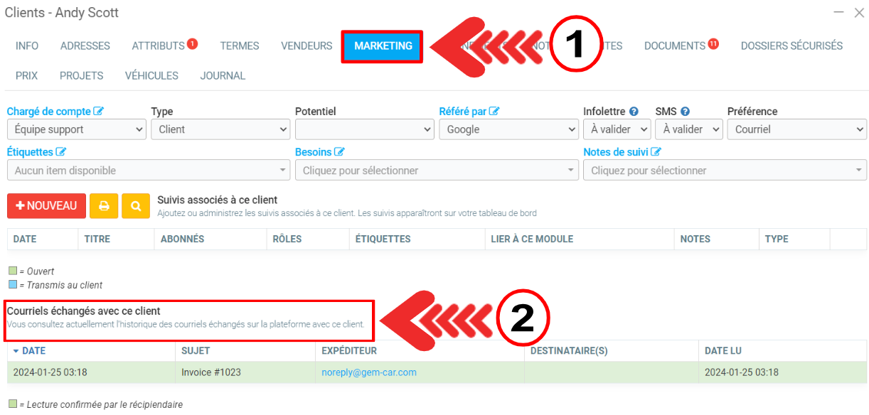 Consultation de l'historique des échanges courriel pour un client en particulier