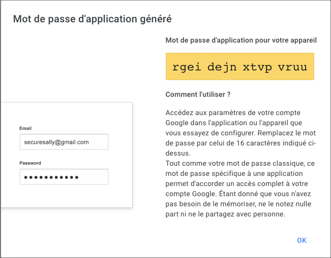 Dans le cas d'un courriel Google Gmail, vous devrez d'abord créer mots de passe d'application.