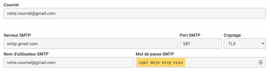 Voici les configurations pour un Gmail. Suivez les instructions de la section Autres options de configuration et Utiliser le serveur SMTP Gmail.