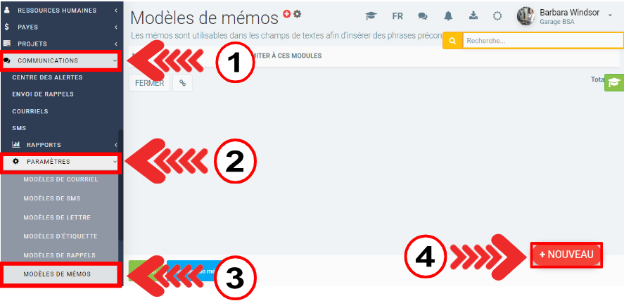 Pour créer le modèle de mémo, cliquez sur Communications > Paramètres > Modèles de mémos > +Nouveau.