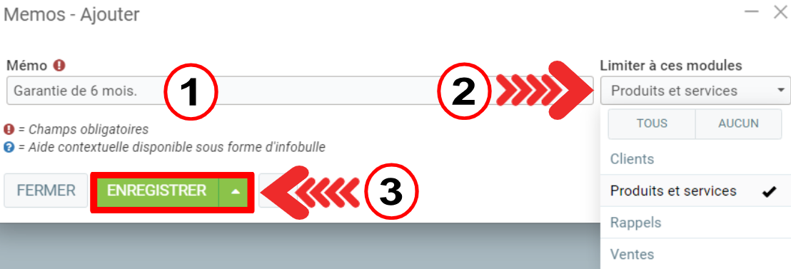 - Limiter à ces modules (vous pouvez choisir parmi les options suivantes: Clients, Produits et services, Rappels, Ventes).