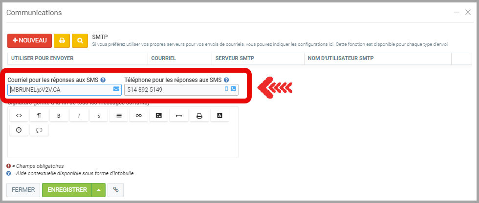 Pour envoyer des messages par SMS et surtout recevoir des réponses à ceux-ci, il est nécessaires de compléter la configuration des Communications.
