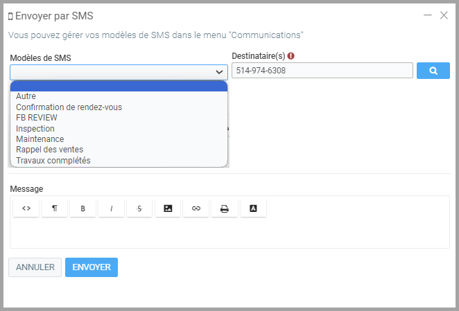 Rédigez un message personnalisé ou choisissez un modèle de SMS préconfiguré.