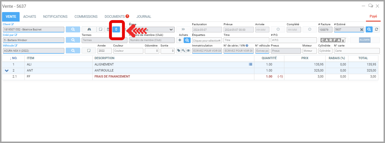 Le même bouton se trouve sur l'interface de l'horodateur toujours à droite du nom du client.