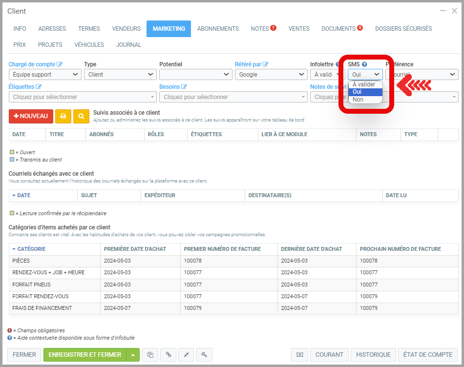 Dans le dossier du client, trouvez cette information sous l'onglet Marketing, sous SMS.