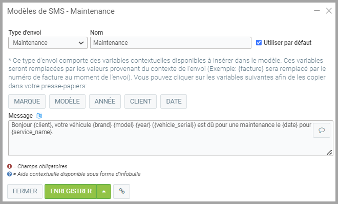 Bonjour {client}, votre véhicule {brand} {model} {year} ({vehicle_serial}) est dû pour une maintenance le {date} pour {service_name}.