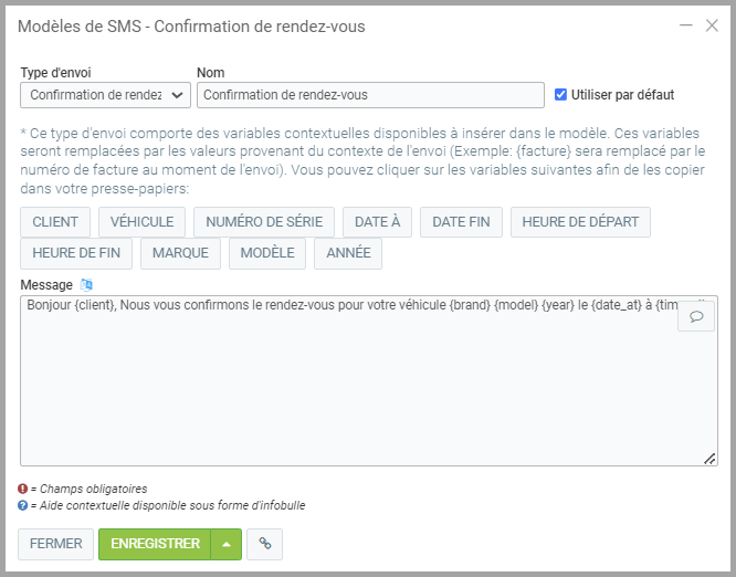 Bonjour {client}, Nous vous confirmons le rendez-vous pour votre véhicule {brand} {model} {year} le {date_at} à {time_at}.
