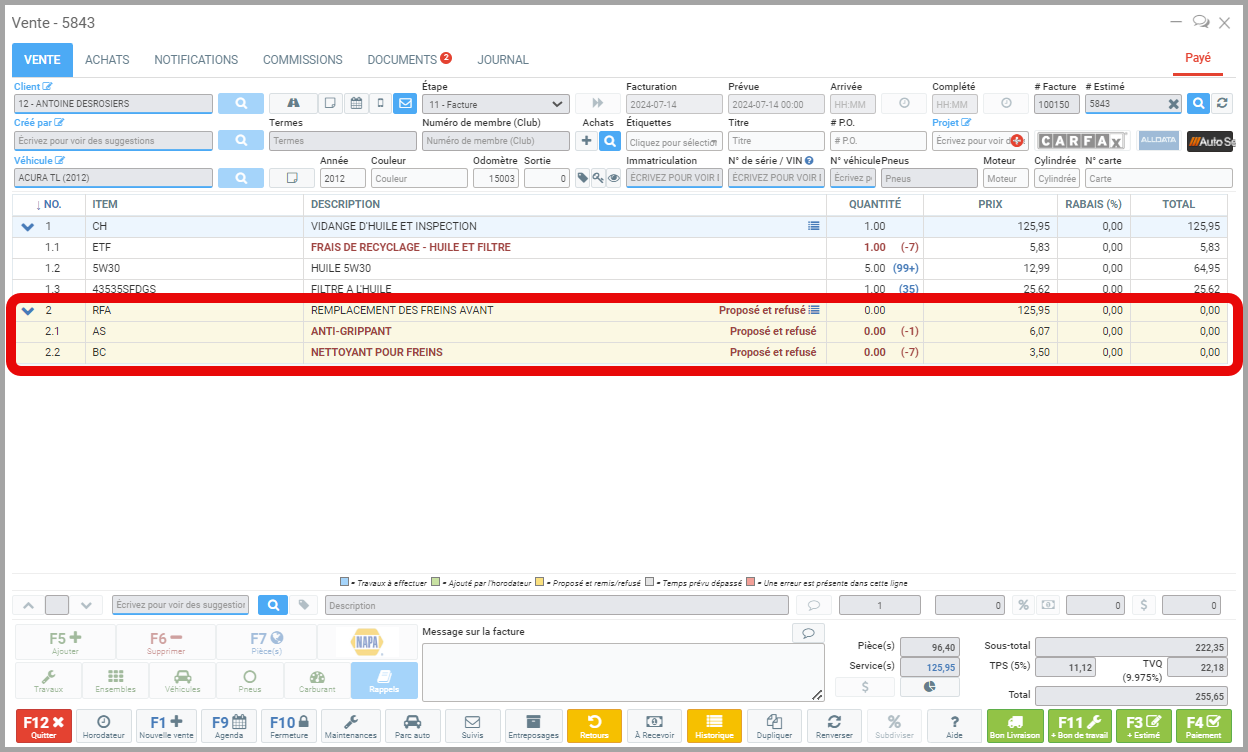 La mention Proposé et refusé apparaît maintenant sur le travail à effectuer et sur les pièces qui y sont associées. Notez également que le prix associé à ce travail est à 0$.