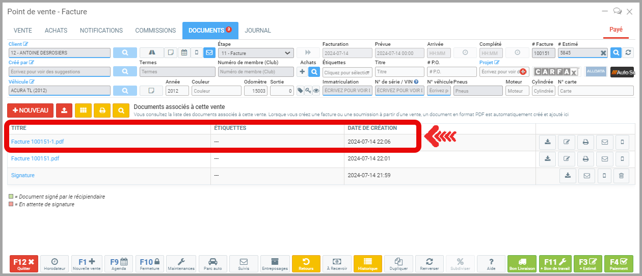 Une fois l'estimé terminé, il suffit de compléter le Paiement (F4) en cliquant sur le bouton situé en bas à droite. Une fois le paiement complété, la facture est produite sous l'onglet Documents. Les travaux proposés et refusés apparaissent.