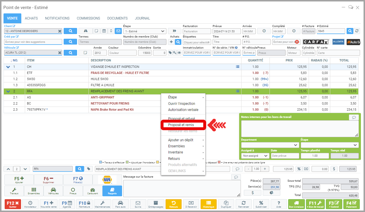 Sinon, le client peut accepter d'être rappelé à une date ultérieure pour prendre un rendez-vous et effectuer le travail, soit le remplacement des freins avant dans le cas qui nous concerne. Dans ce cas, l'aviseur technique sélectionne Proposé et remis.