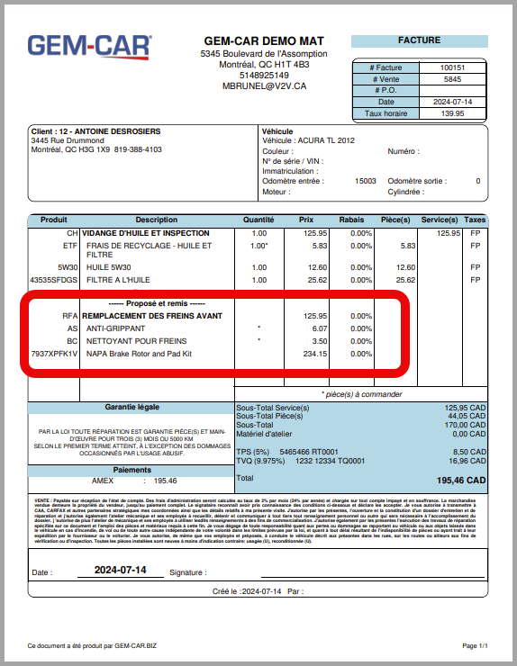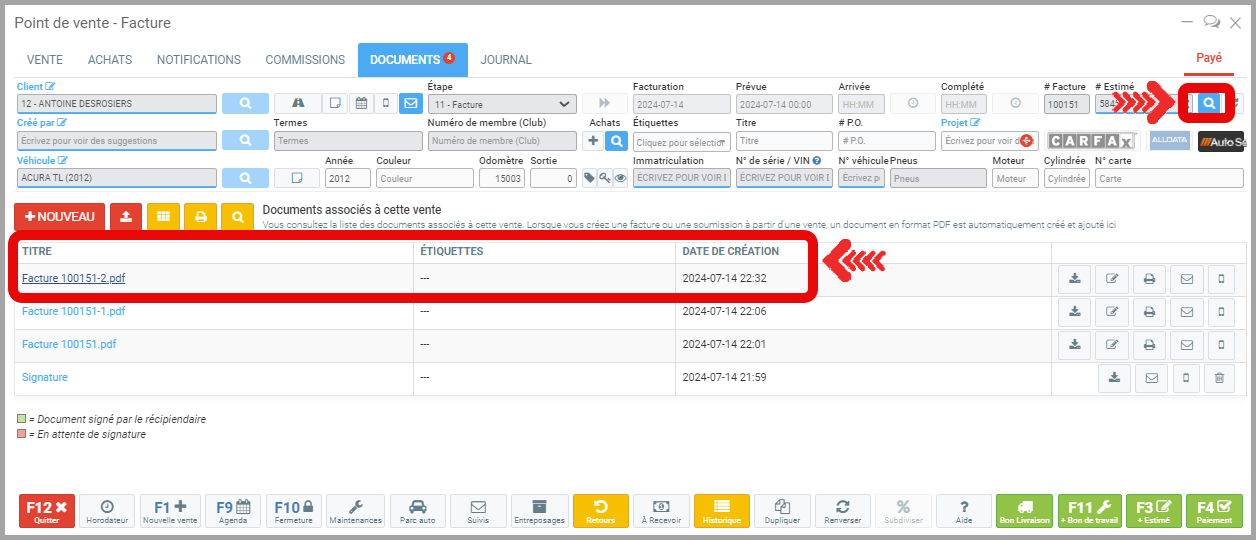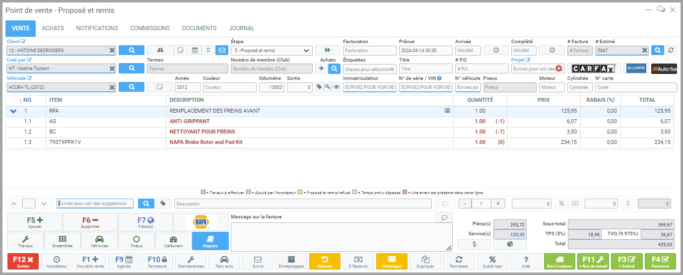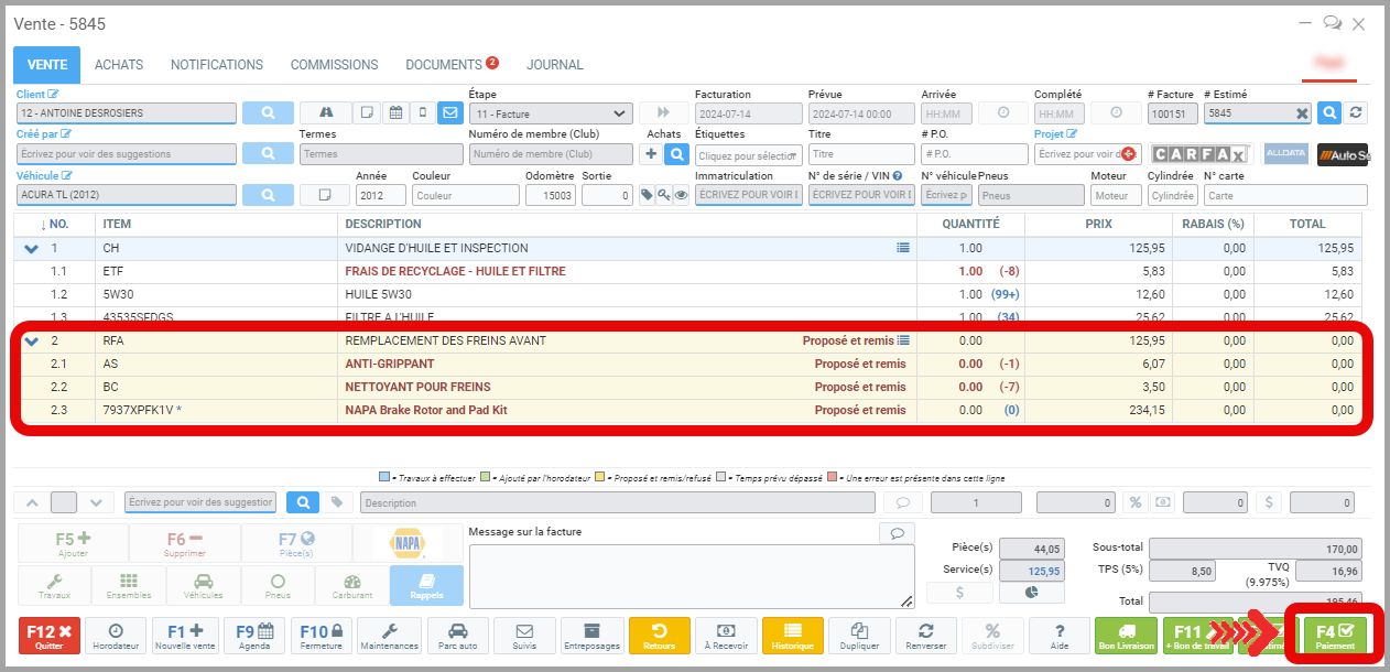 Pour obtenir un estimé pour les items proposés et remis, il suffit de compléter le Paiement (F4) en cliquant sur le bouton situé en bas à droite. Une fois le paiement complété, la facture est produite (1) et une nouvelle vente est commencée pour le changement des freins dans le cas ci.